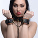 Lock up your slave in this attractive and unique collar to wrist restraint set.